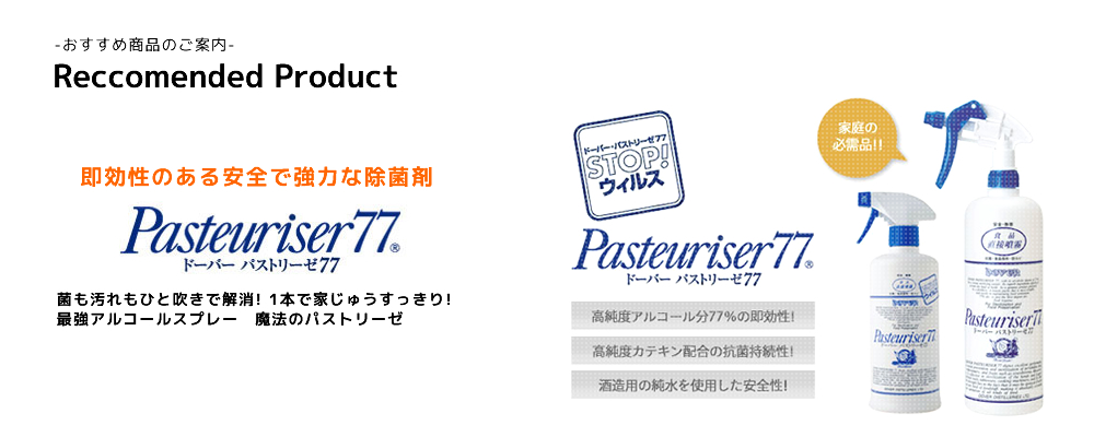 パストリーゼ77」は、消防法に認可された完全自動設備での生産を実現しました。酒造会社ならではの遺伝子組み換えを行っていないサトウキビ原料由来の醸造用アルコールを使用、77%濃度による非常に強力な除菌力を有します。緑茶から抽出した高純度カテキンを配合、さらに純水を使用し長期間の抗菌持続性も実現しました。休日前にご使用いただく事で、より一層休日後の安心を高めます。